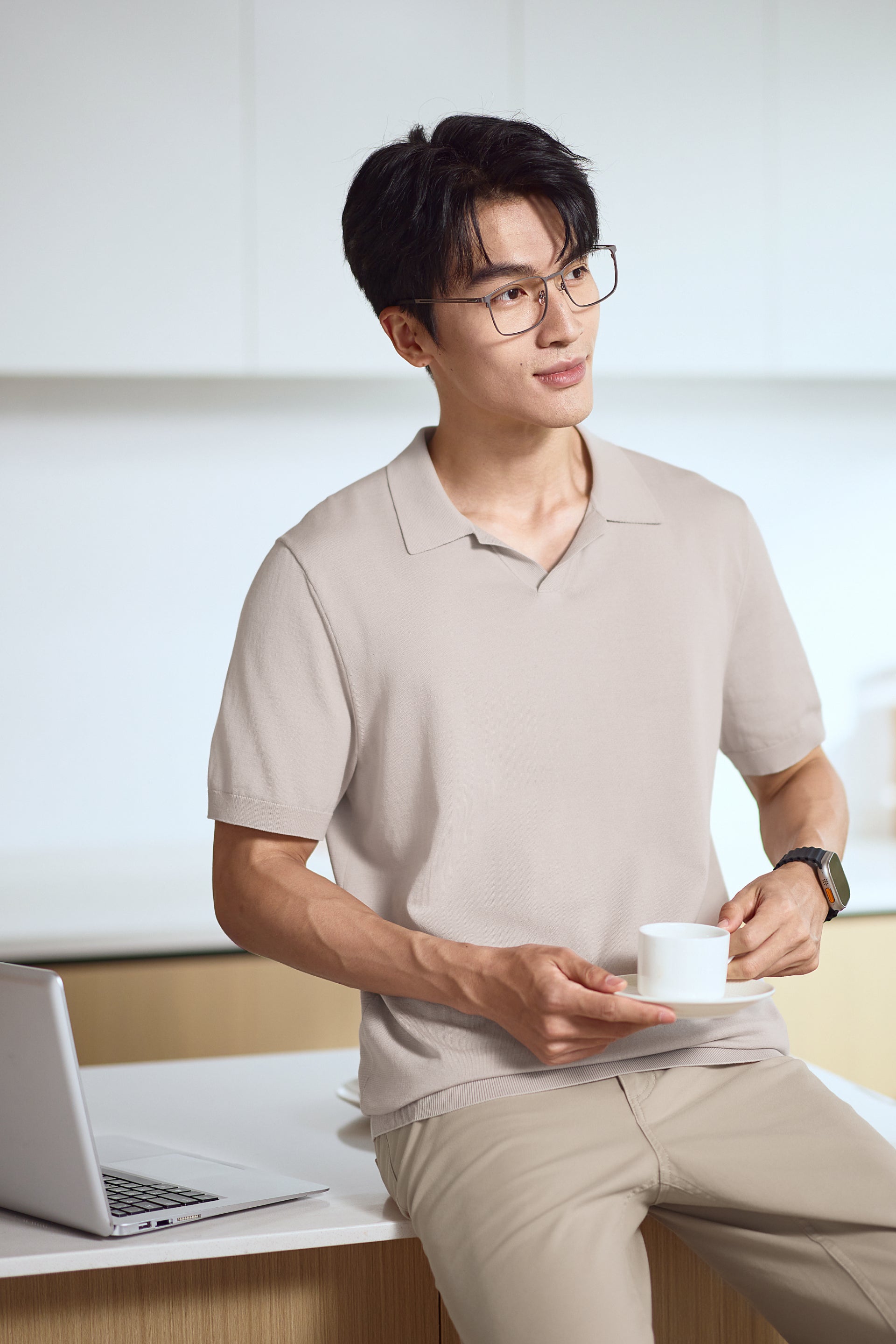 微弧形的無鈕領口設計,低調提升整體質感,同時在視覺上修飾頸部線條,營造更修長比例。袖口與下擺加入彈性收口細節,有效減少鬆垂或變形,維持乾淨利落的線條,讓造型由日間到晚間都能保持精緻有型。