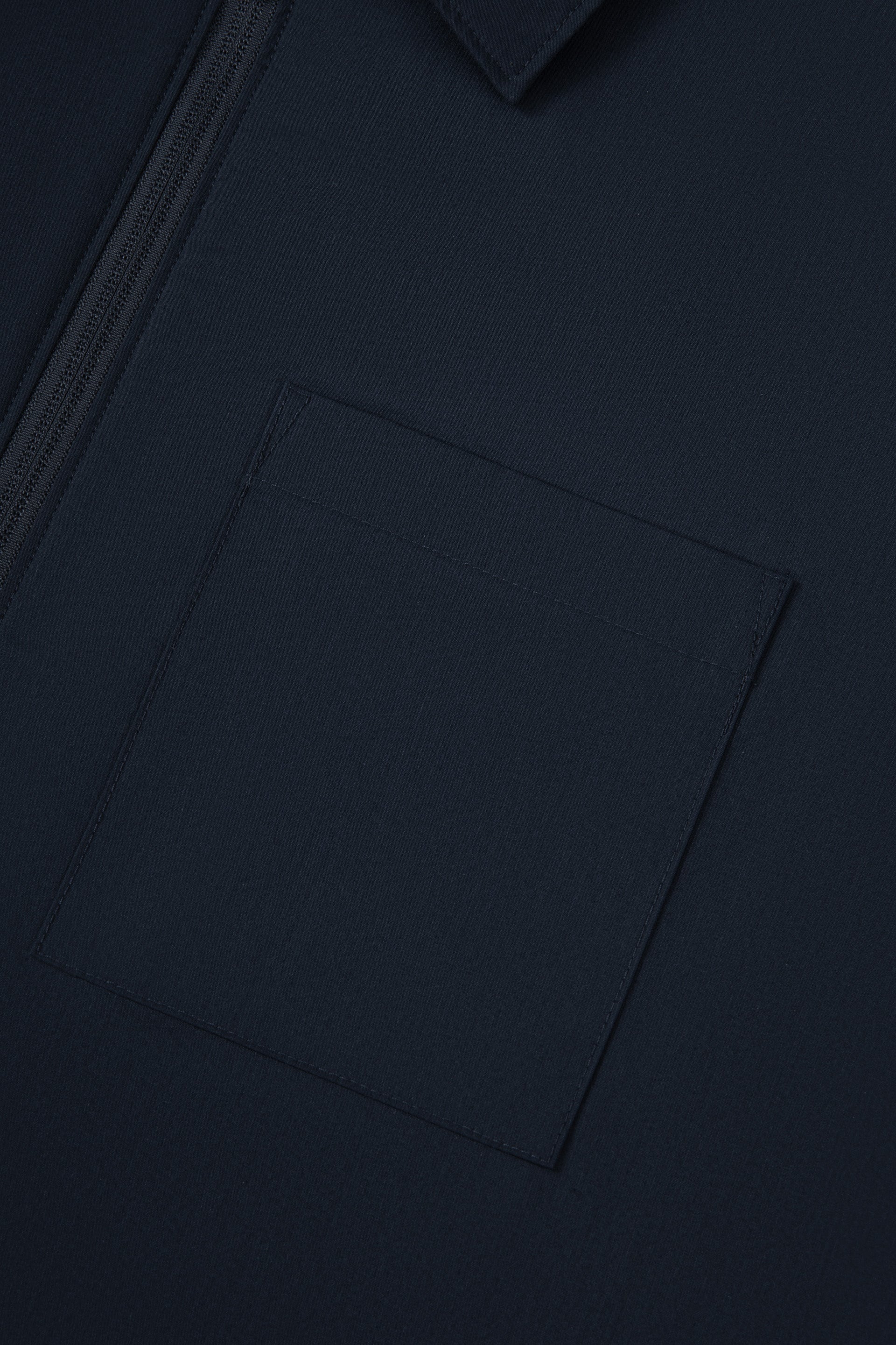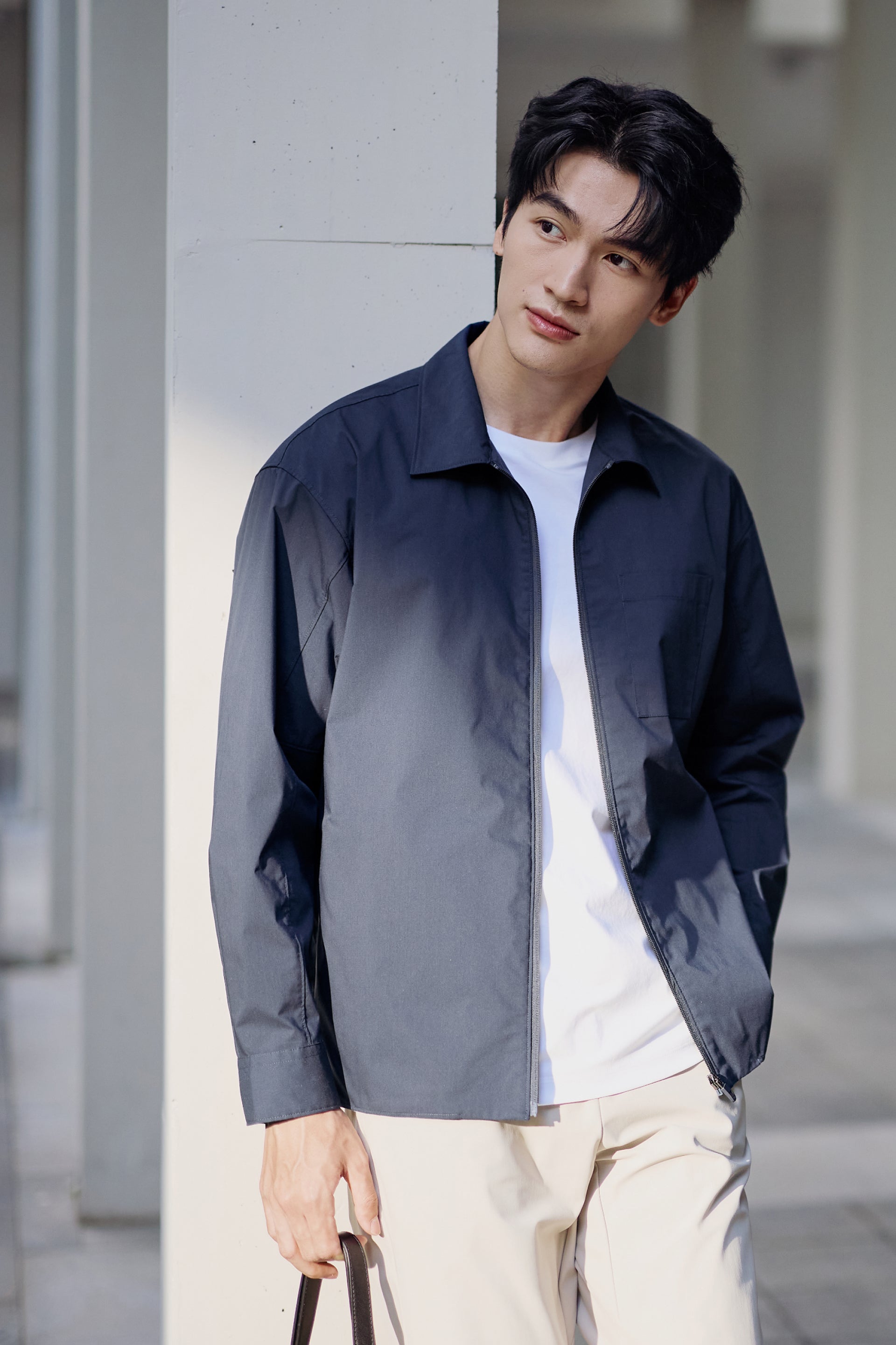 UV 防護輕量襯衫外套 結合機能設計與日常穿搭需求。採用拉鏈前襟設計,配以胸袋及拉鏈側袋,以簡潔線條勾勒低調而實用的造型細節,展現俐落現代感。
