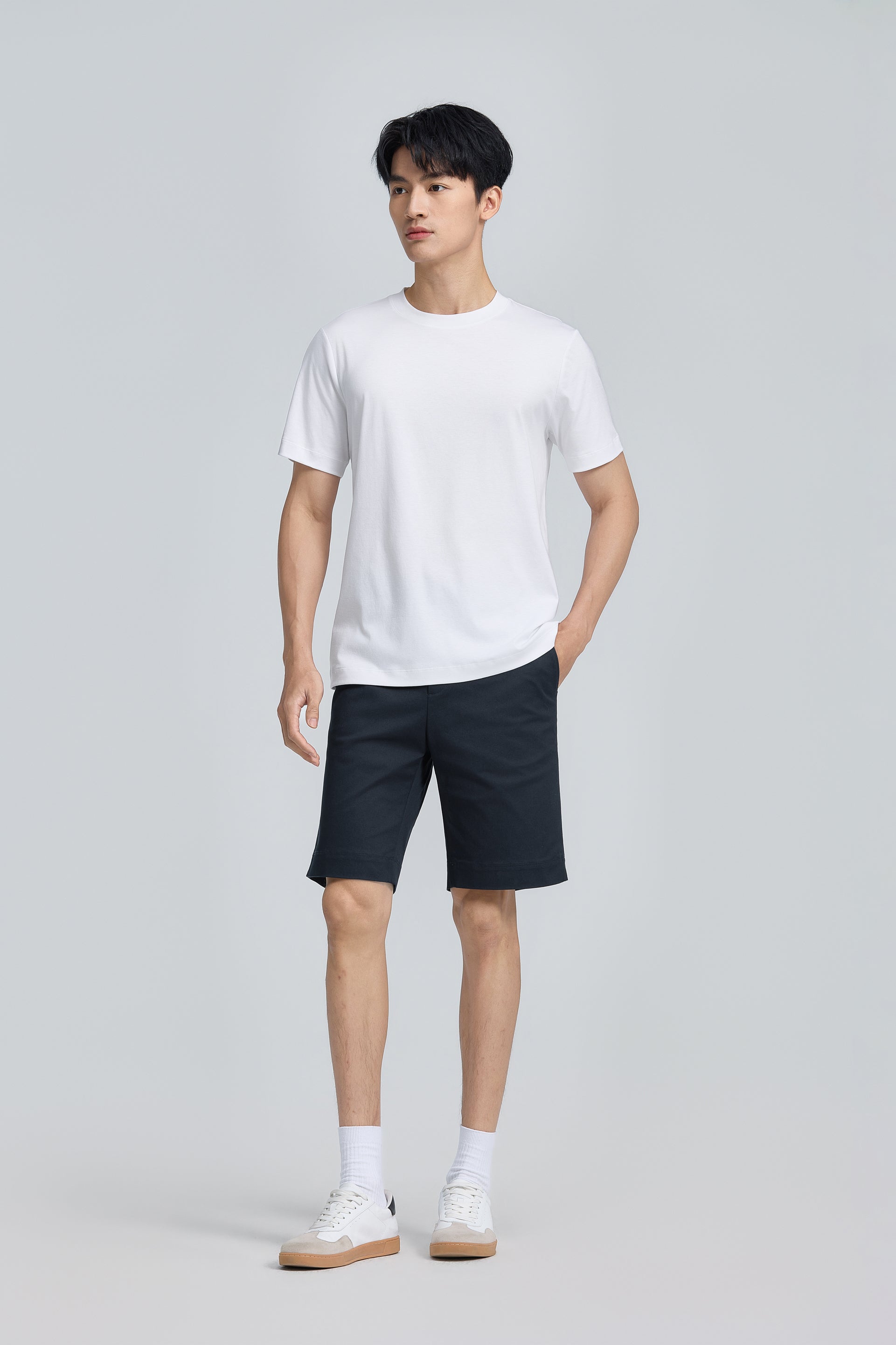 羊毛棉混紡修身圓領 T 恤 是在基本素 T 之上的升級選擇。採用羊毛棉混紡雙面針織布料,版型為俐落合身剪裁,布面帶有細緻的雜色紋理,並透過超細緻羊毛纖維則帶來自然微光澤與更細膩的手感。